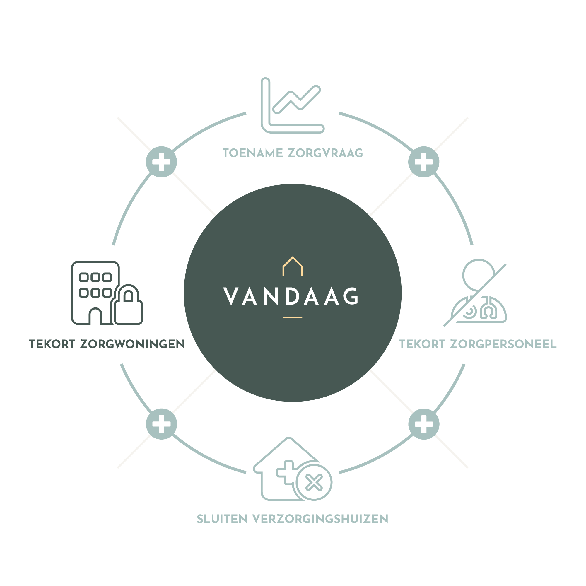 De vergrijzing neemt toe, hiermee ook de zorgvraag. Het personeelsbestand in de zorg loopt echter terug en de verzorgingshuizen en aanverwante woonvormen worden gesloten. Ouderen met een zorgvraag blijven omdat er geen alternatief is toch thuis wonen, eigenlijk in woningen die te groot zijn en vaak niet geschikt zijn om zorg in te kunnen verlenen. Bovendien door spreiding door de gemeente heen erg ineffectief om überhaupt zorg te kunnen leveren. Het concept VANDAAG Wonen & Leven biedt een uitkomst voor deze groep senioren en draagt zo bij aan de aanwas van geschikte zorgwoningen.